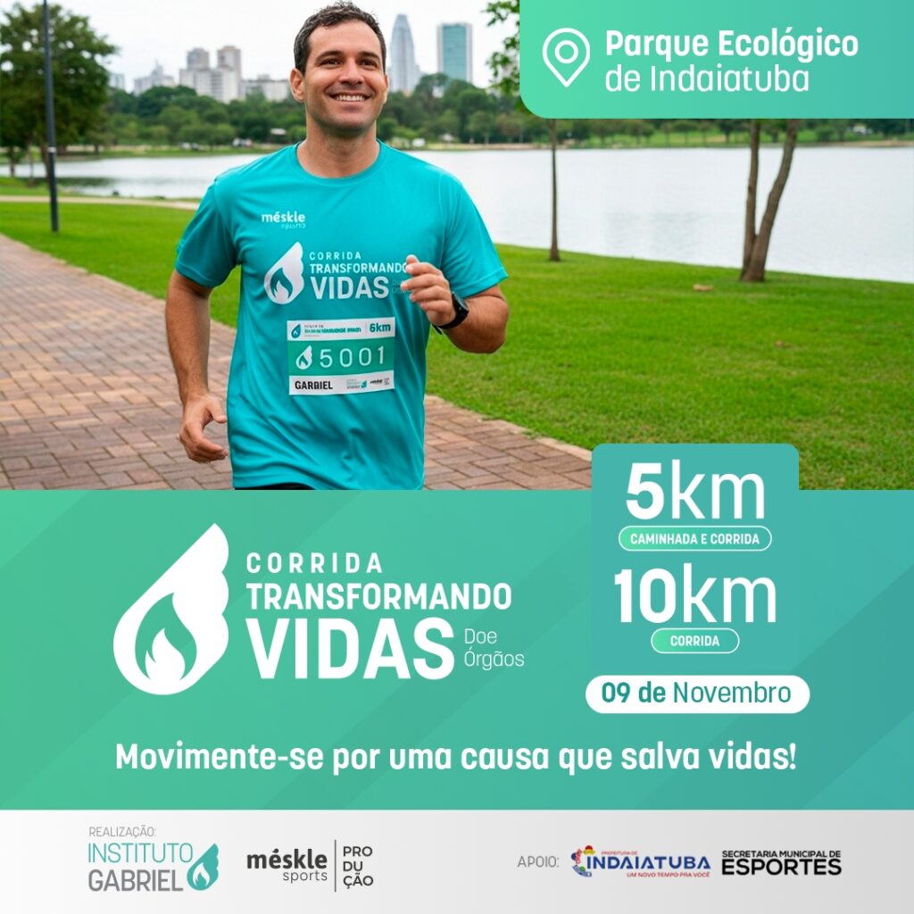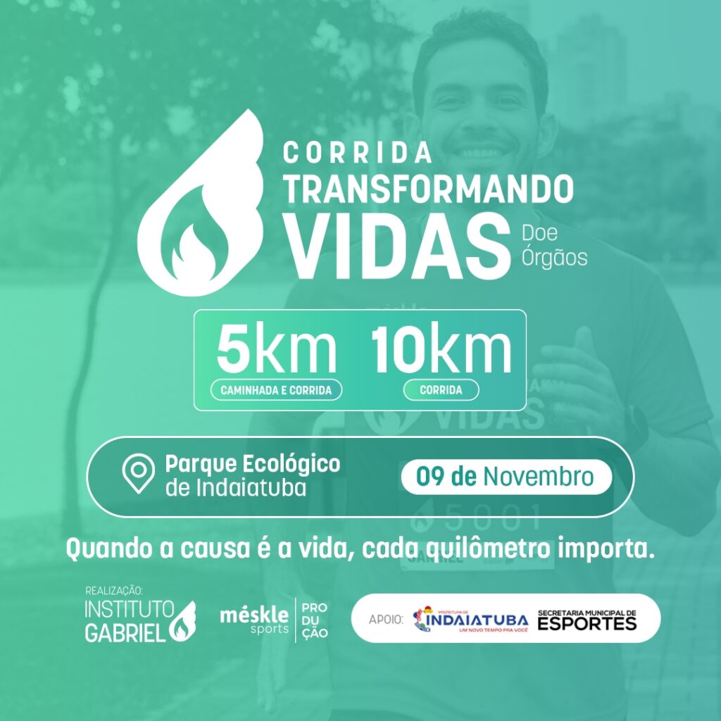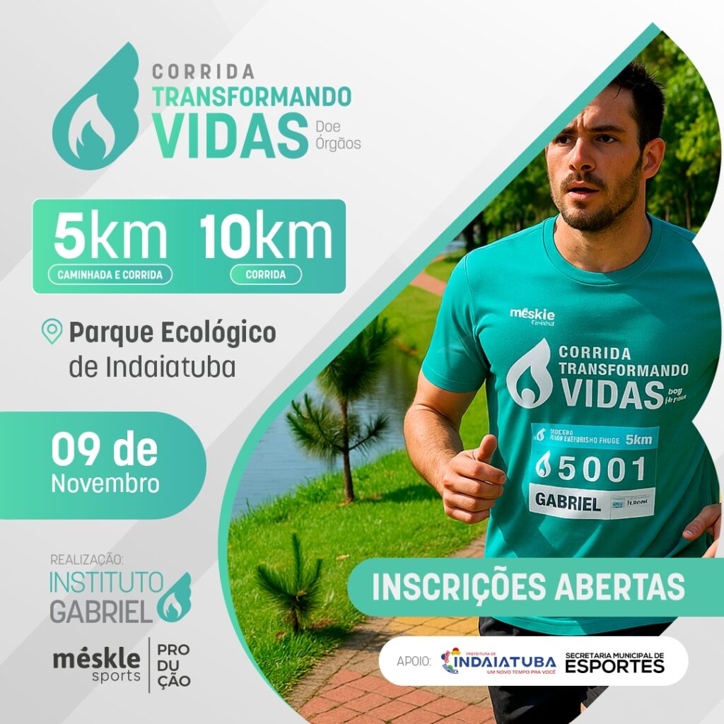 Indaiatuba, setembro de 2025 – Quem espera por um transplante não pode esperar. A sua participação pode fazer a diferença por quem corre contra o tempo. No dia 09 de novembro de 2025 (domingo), o Parque Ecológico de Indaiatuba será palco da 1ª Corrida Transformando Vidas – Doe Órgãos, uma iniciativa do Instituto GABRIEL, com realização da Méskle Sports e apoio da Prefeitura de Indaiatuba e da Secretaria Municipal de Esporte.