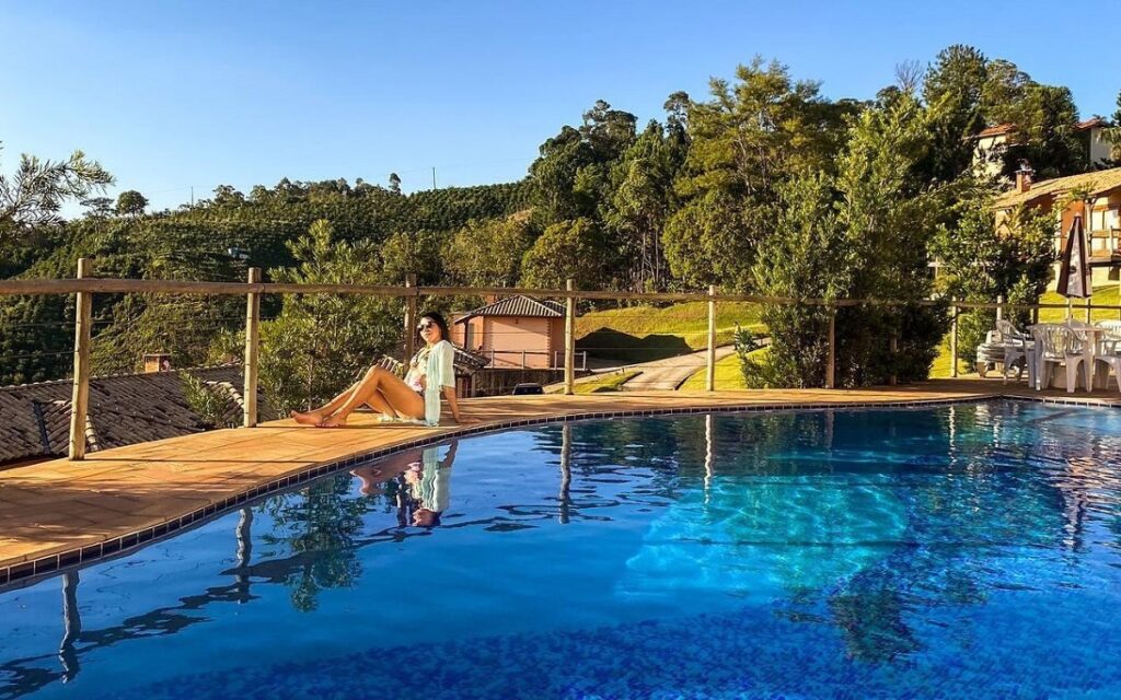 A estrutura da pousada inclui piscina aquecida coberta, piscina externa, sauna a vapor, salão de jogos com decoração retrô e espaço fitness, além de áreas verdes integradas à natureza. As piscinas funcionam 24 horas.
