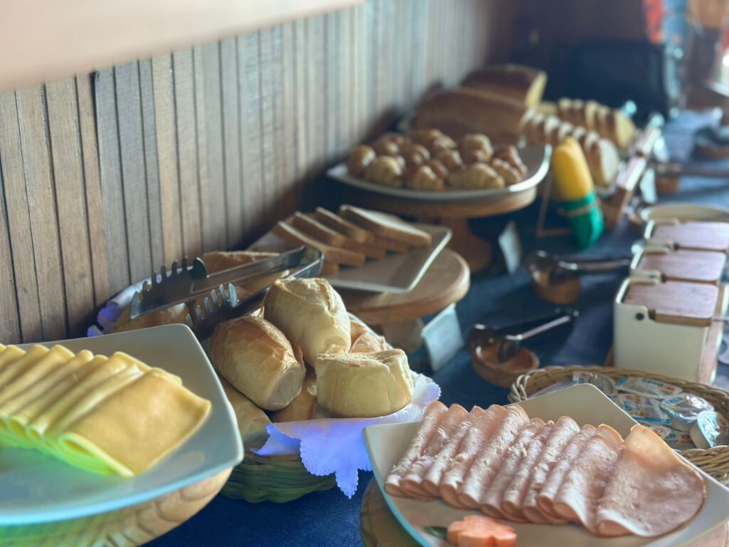 Outro diferencial da hospedagem é o café da manhã servido das 8h30 às 11h30, que reúne mais de 55 itens preparados artesanalmente, incluindo receitas típicas da região. Pães, bolos, doces caseiros e outras especialidades fazem parte da mesa, valorizando ingredientes frescos e o estilo acolhedor das pousadas da serra.