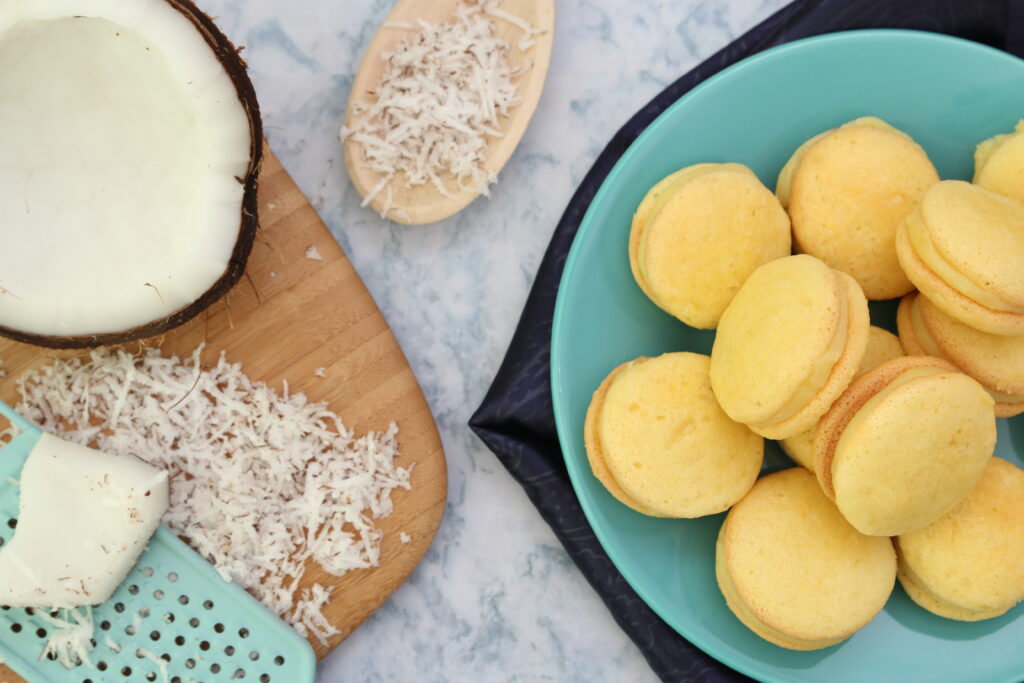 A segunda opção traz um doce clássico que todo mundo adora: os Bem-casados de Baba de Moça com Coco, feitos também com Farinha de Trigo Finna Tradicional, eles ficam perfeitos para adoçar o dia, sem precisar esperar por uma festa.