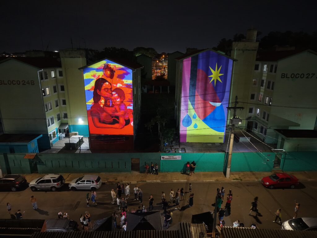 O festival reuniu moradores de todas as idades, que se emocionaram com o espetáculo de luzes e sons projetado sobre as fachadas dos prédios. As projeções deram vida às pinturas e transformaram o bairro em um grande palco a céu aberto. A comunidade também pôde experimentar os óculos de realidade virtual, mergulhando em um vídeo imersivo que revelou o processo de criação das obras e o cotidiano das artistas durante a produção dos murais. A experiência despertou curiosidade, encantamento e foi um sucesso entre crianças, jovens e adultos.