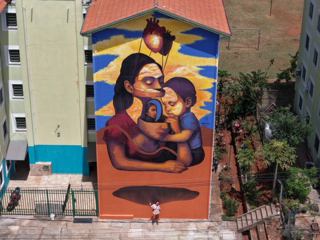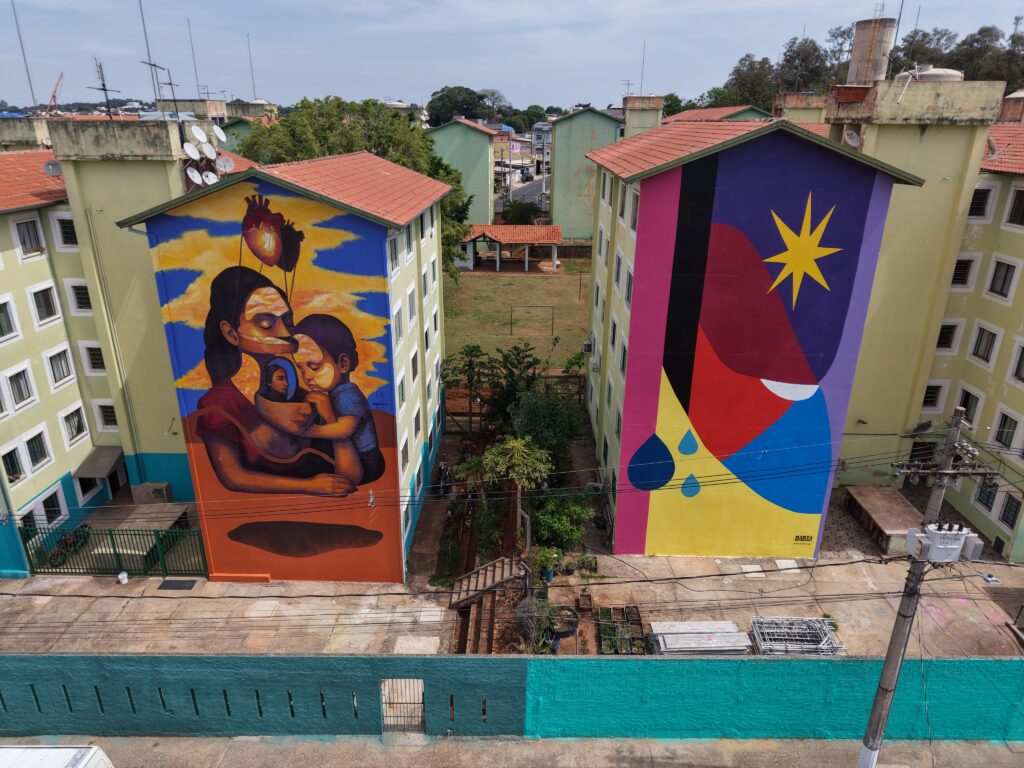 O projeto também contou com a participação da artista Gislaine Martins (Gim), que retratou o tema da maternidade em um mural de tons quentes. A presença de duas artistas com estilos distintos – o geométrico e vibrante de Miss e o figurativo surrealista de Gim – criou um diálogo visual de contraste e harmonia, com diferentes formas de representar o mesmo território.