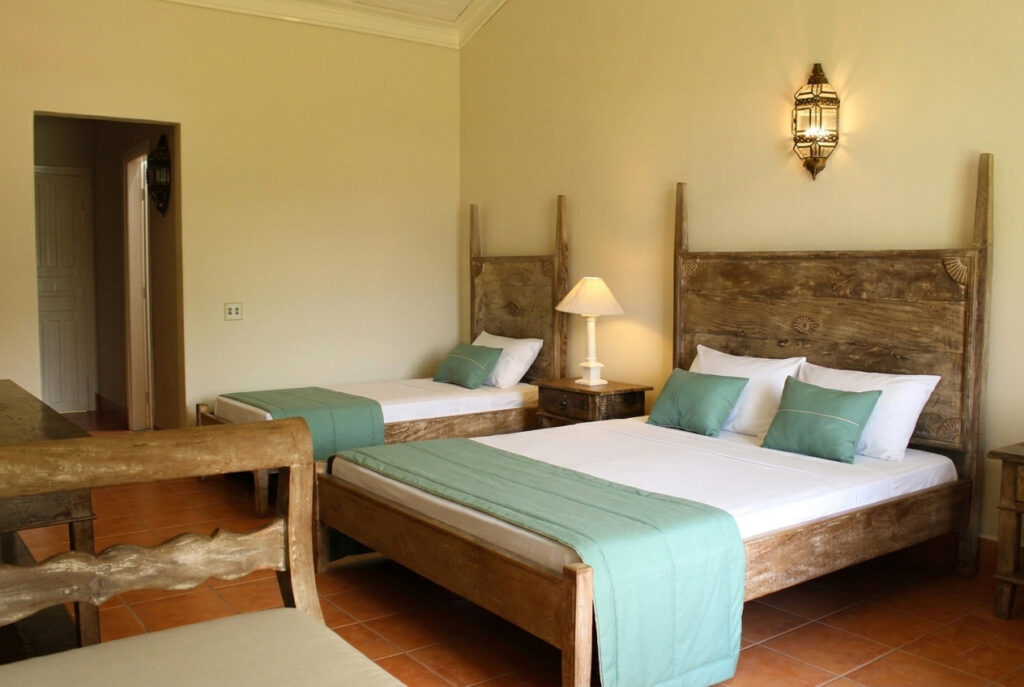O hotel oferece suítes nas categorias máster, luxo e superior, decoração colonial e vista para os jardins e para o antigo terreiro de café, hoje transformado em praça de convivência.