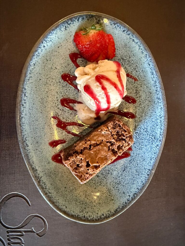 E para adoçar o momento, uma sobremesa que ficará marcada: o Brownie artesanal. Diferente de tudo que já provei ao longo da minha experiência na gastronomia, o doce vem acompanhado de gelato de baunilha e uma calda delicada de frutas vermelhas, surpreendendo pelo sabor e pela apresentação.