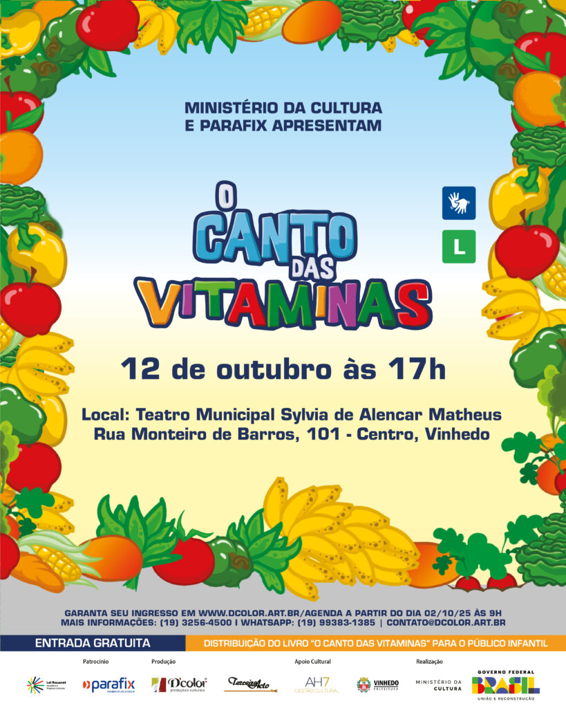 O espetáculo infantil O Canto das Vitaminas tem sessão única e gratuita, em Vinhedo (SP), no dia 12 de outubro. A peça traz as peripécias de uma garota que descobre o quão colorido é o mundo dos alimentos e será encenada às 17h no Teatro Municipal Sylvia de Alencar Matheus.