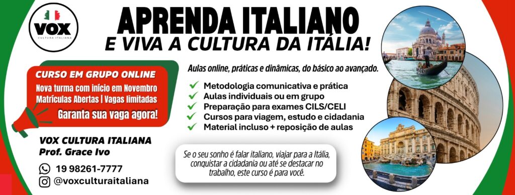 Falar italiano é muito mais do que aprender um idioma — é viver a arte, a história e o charme de um país que inspira o mundo. E é exatamente isso que a Vox Cultura Italiana, idealizada pela professora Grace, propõe: uma verdadeira imersão cultural, onde cada aula se transforma em uma experiência única e apaixonante.